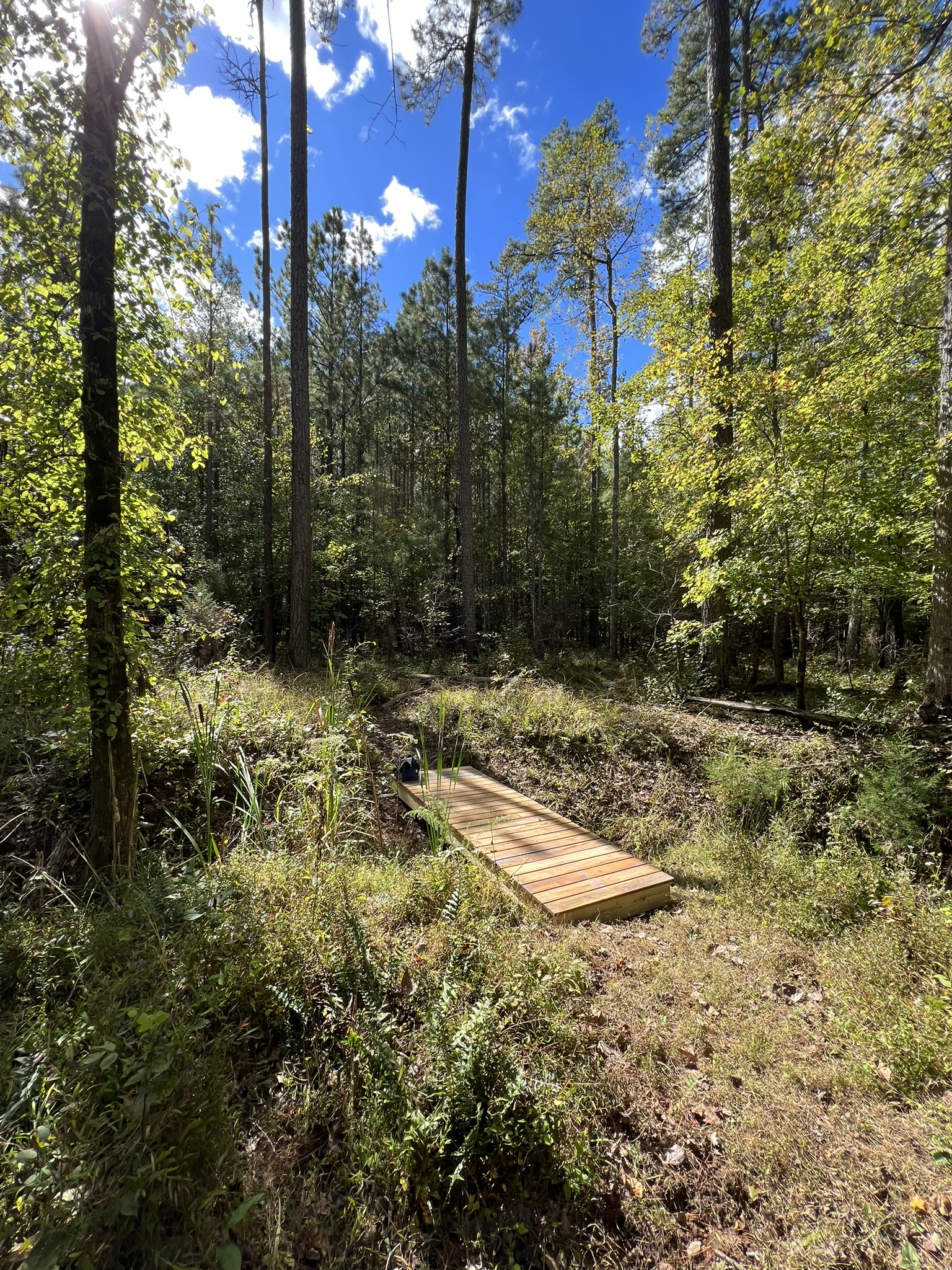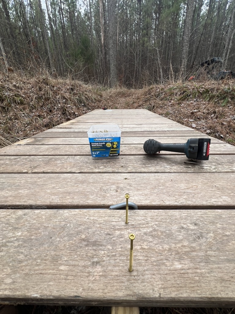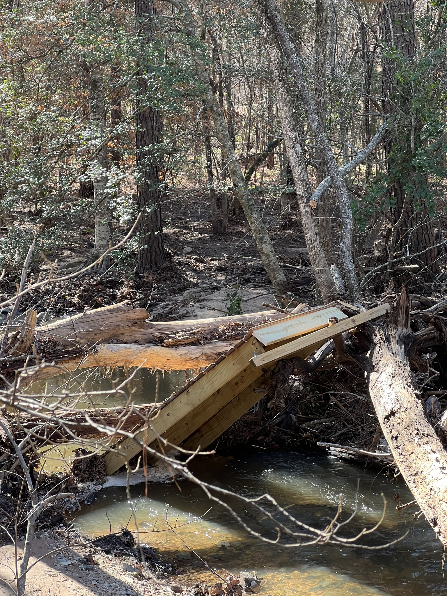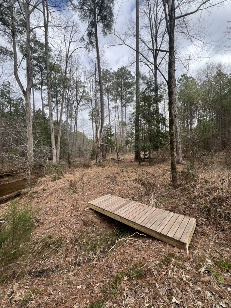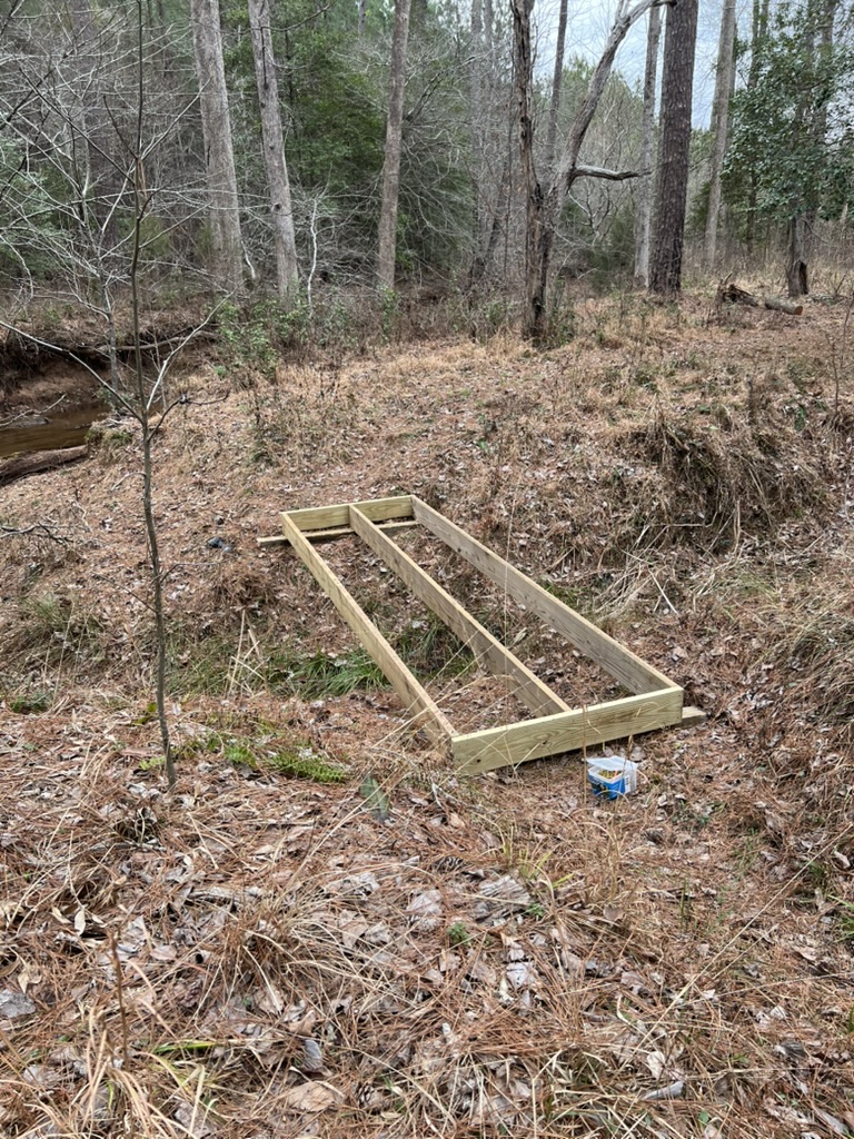 In October of 2023, we built a small footbridge across a drain near the beaver dam on Cheek Creek. Three months later (Jan 9, 2024) a major storm came through and the bridge floated, mostly undamaged, about 3/4 mile down the creek. This week we finally disassembled it and built it back where it belongs. We’re going to chain it to a tree so that hopefully next time it stays put.