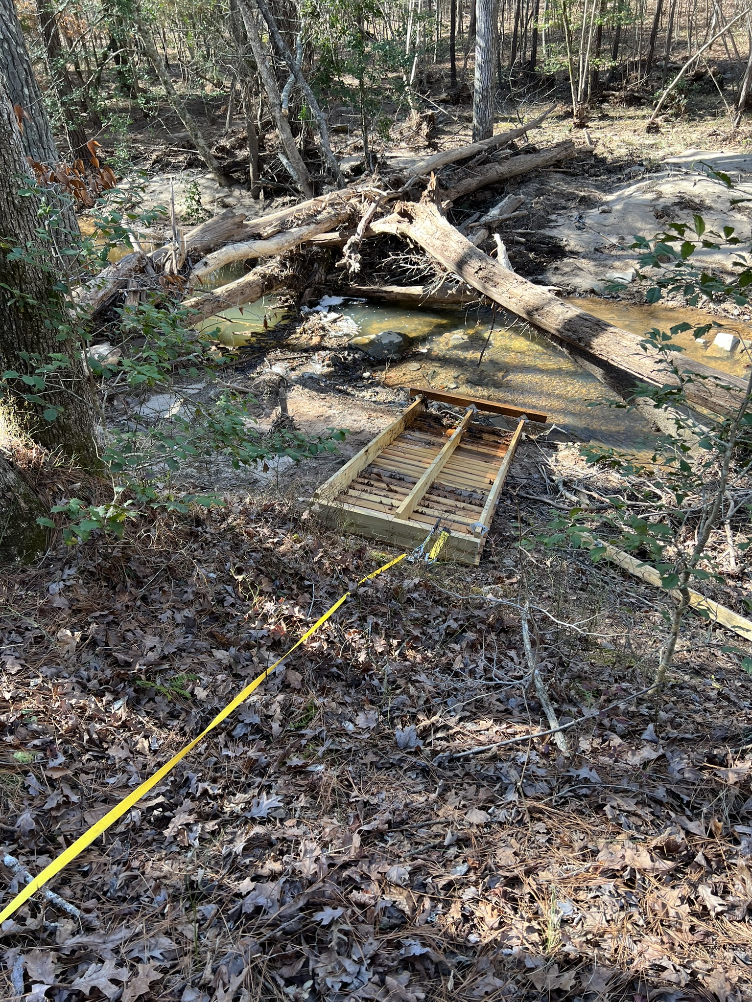 In October of 2023, we built a small footbridge across a drain near the beaver dam on Cheek Creek. Three months later (Jan 9, 2024) a major storm came through and the bridge floated, mostly undamaged, about 3/4 mile down the creek. This week we finally disassembled it and built it back where it belongs. We’re going to chain it to a tree so that hopefully next time it stays put.